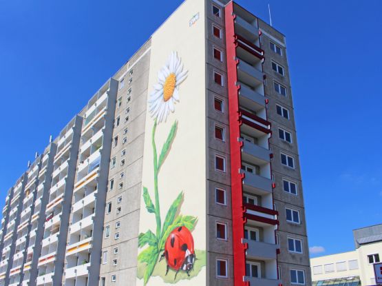 Im Auftrag der Schweriner Wohnungsbaugenossenschaft brachte der Airbrushkünstler Kai Arendt seine überdimensionale Blume an das Gebäude. Die Margerite ist größer als die kleinen Blumen, die im Garten blühen. Das Gebäude ist 32 Meter hoch, die Blume an der Wand etwa 20 Meter. Da muss man schon schwindelfrei sein, um die Fassade zu bemalen.