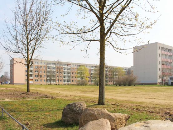 Hier, wo einst der Fünfgeschosser Lomonossowstraße 3-8 stand, ist nach Abriss des Wohnhauses eine Grünfläche angelegt worden. Der Block wurde Ende des letzten Jahres Platte für Platte abgetragen.