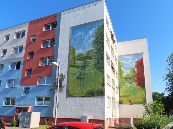 Hier hat der Airbrush-Künstler Kai Arendt, der auch schon andere Fassaden unserer Genossenschaft verschönert hat, ein zweigeteiltes Bild auf die Giebel der Wohngebäude gebracht. Auf humoristische Art, symbolisiert durch einen schaukelnden Frosch und einen neugierigen Wichtel, zeigt er die schöne Mecklenburgische Landschaft. Im richtigen Winkel betrachtet, fügen sich die beiden Bilder zu einem Gesamtwerk zusammen.
