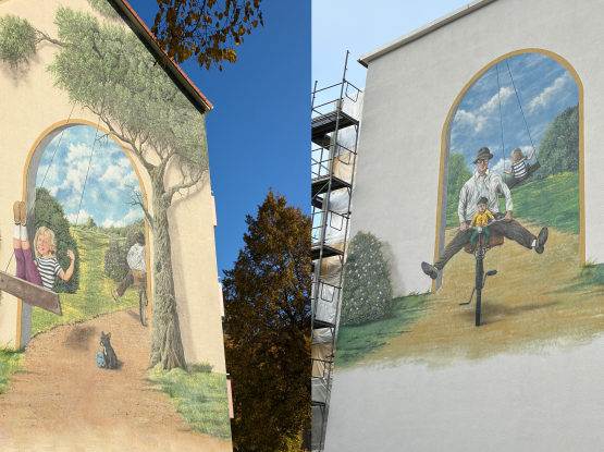 Stellen Sie sich doch gern mal zwischen beide Häuser und lassen Sie das Kunstwerk auf sich wirken.