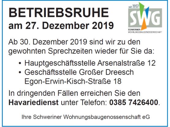 Am Montag, 30.12.2019 sind wir wie gewohnt ab 8.00 Uhr wieder für Sie da. An diesem Tag endet die Öffnungszeit um 14.00 Uhr.
