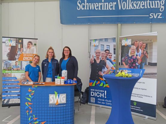 Auch die Schweriner Wohnungsbaugenossenschaft eG war wieder mit dabei. Ausbilderin Nadin Schluszas und zwei Auszubildende betreuten den Stand der SWG und beantworteten die Fragen der Interessenten.